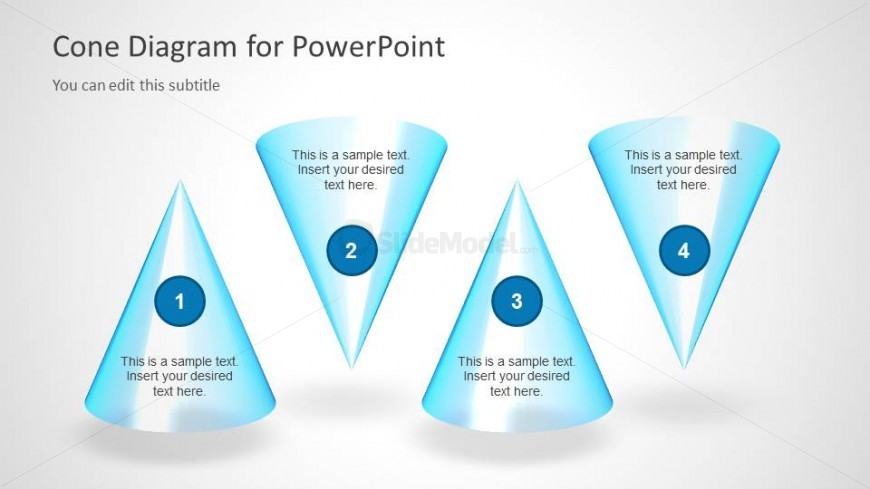 Four Cone diagrams for PowerPoint contains 4 unique 3D cone diagrams created in PowerPoint and two of these cones are inverted in the slide design.