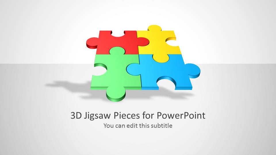 3D Jigsaw Piece Shapes for PowerPoint is a presentation template containing slide designs with 4 jigsaw pieces that you can use as metaphors for business and strategy presentations. The slide designs can be used to model a puzzle with colorful jigsaw pieces.