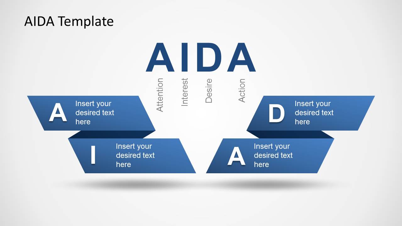 AIDA template for PowerPoint is a presentation design based on the AIDA model. AIDA stands for Attention or Awareness, Interest, Desire and Action and the AIDA model is used commonly in marketing and advertising to describe a common list of events that may occur when a consumer engages with an advertisement. You can download this AIDA PowerPoint template to prepare presentations on Marketing and Advertising using Microsoft PowerPoint.