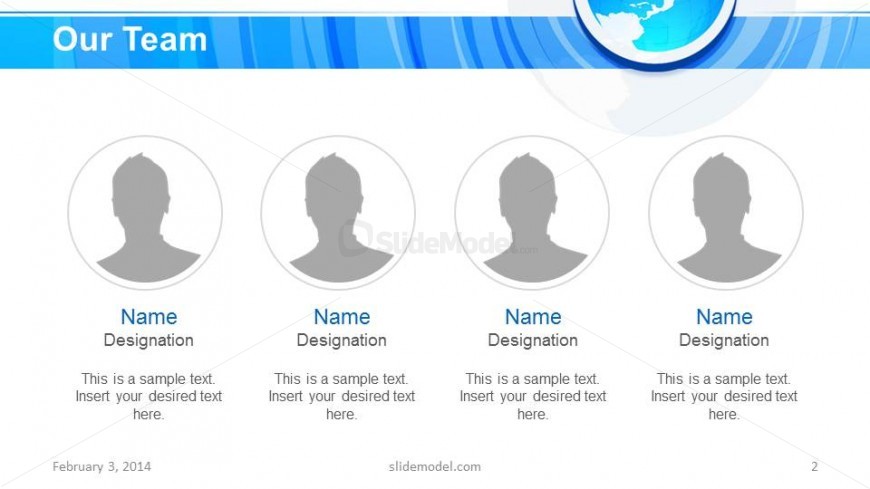 Our team slide design for PowerPoint presentations with four picture placeholders ready to describe a team of up to four team members.
