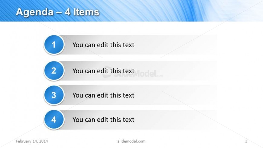 4 Items Agenda slide design for PowerPoint presentations that you can use to describe your Marketing Plan presentations including topics like Planning, Execute, Review & Control.