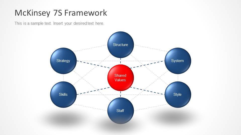 Blue McKinsey 7S Diagram for PowerPoint is a presentation template that you can use to represent the McKinsey 7S model in a PowerPoint slide. You can use this diagram and model template to make presentations on strategy and marketing.