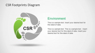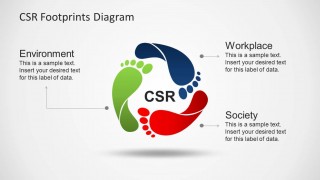 This CSR footprints circular diagram template for PowerPoint is a presentation design useful to make presentations on Corporate Social Responsibility including a footprint cycle diagram that you can use to describe components and stakeholders involved in a CSR presentation including workspace, society and environment.