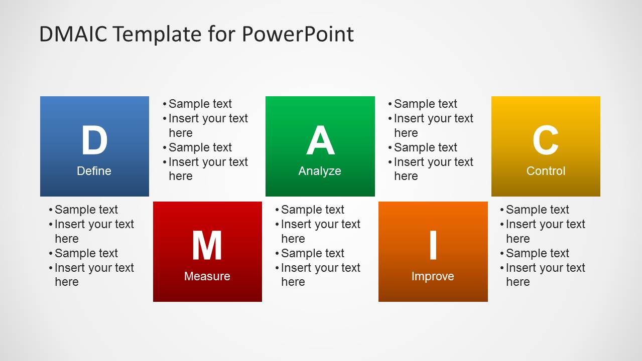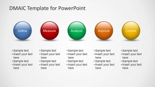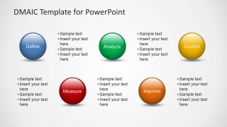 DMAIC Template for PowerPoint is a presentation template containing multiple DMAIC process slide designs. DMAIC stands for Define, Measure, Analyze, Improve and Control and it is a methodology based on these five improvement steps.