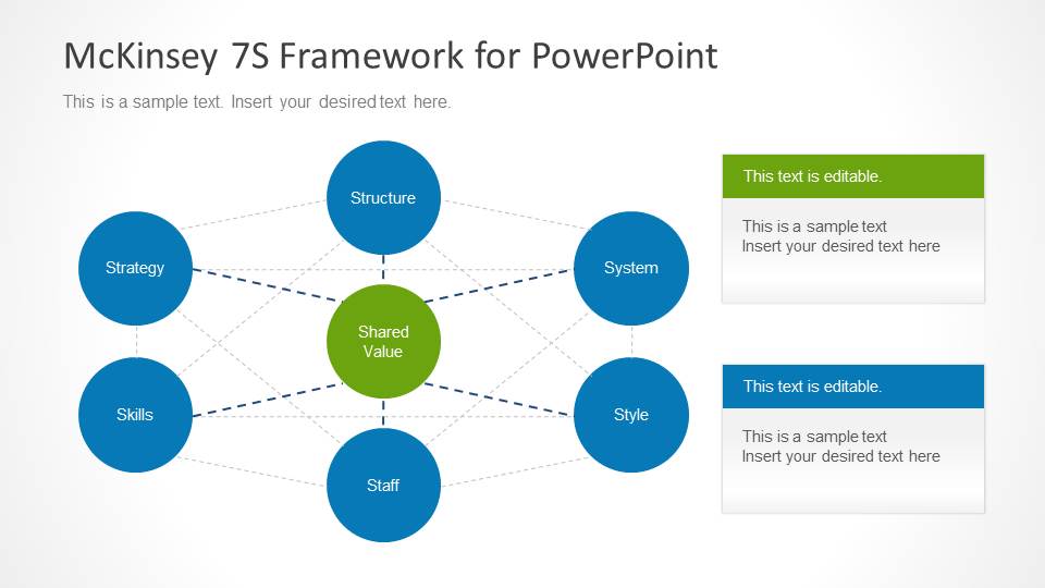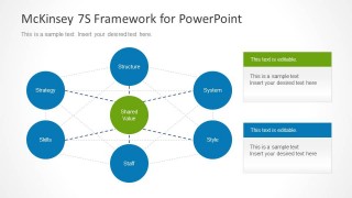 McKinsey 7S Diagram for PowerPoint contains slide designs prepared to make presentations using the McKinsey 7S model framework.