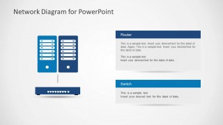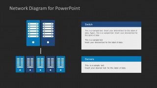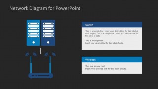 The networking PowerPoint template also contains useful illustrations like firewalls, computer clients and servers, wireless routers and switch illustrations that help to model any network diagram design.