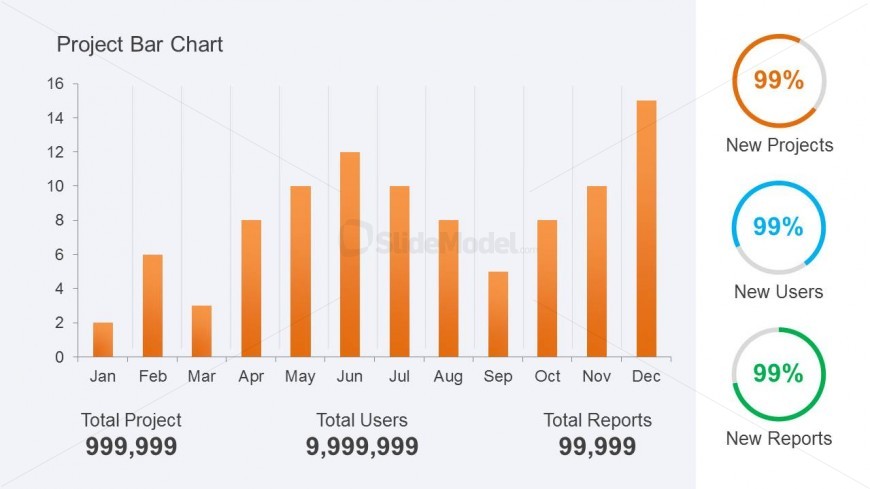 Orange Bar Chart for PowerPoint presentations with months in the X-axis and 3 KPI indicators using donut charts at the right.