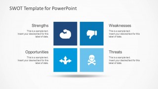 SWOT Analysis is widely used in marketing and business presentations. This simple SWOT analysis template for PowerPoint can help to present your business internal and external factors: strengths, weaknesses, opportunities and threats in a PowerPoint presentation using a nice combination of colors and illustrations identifying each factor.