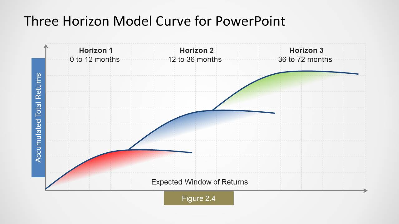Three Horizons Model Curve for PowerPoint is a presentation design template for Microsoft PowerPoint containing the popular three horizons curve design.