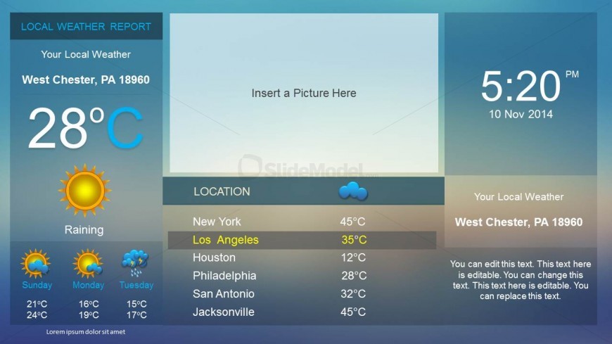 Weather dashboard created in PowerPoint presentations to make presentations on weather reports. This weather PowerPoint template contains placeholders where you can use your own pictures as well as placing the time and date.