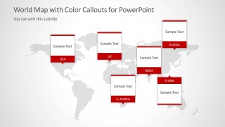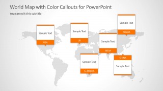 World Map with Color Callouts for PowerPoint is a presentation template with world map shape in the background and colorful editable callouts as text boxes. You can use this presentation template to prepare awesome global presentations and use the callouts as map markers.