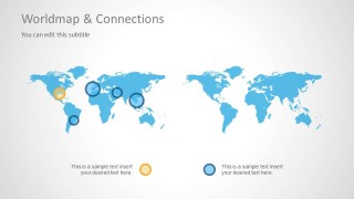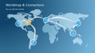Worldmap & Connections PowerPoint Template is a presentation template with a world map illustration in the background of the slide design and markers with connectors that you can use to display a network or global reach in a business PowerPoint presentation.